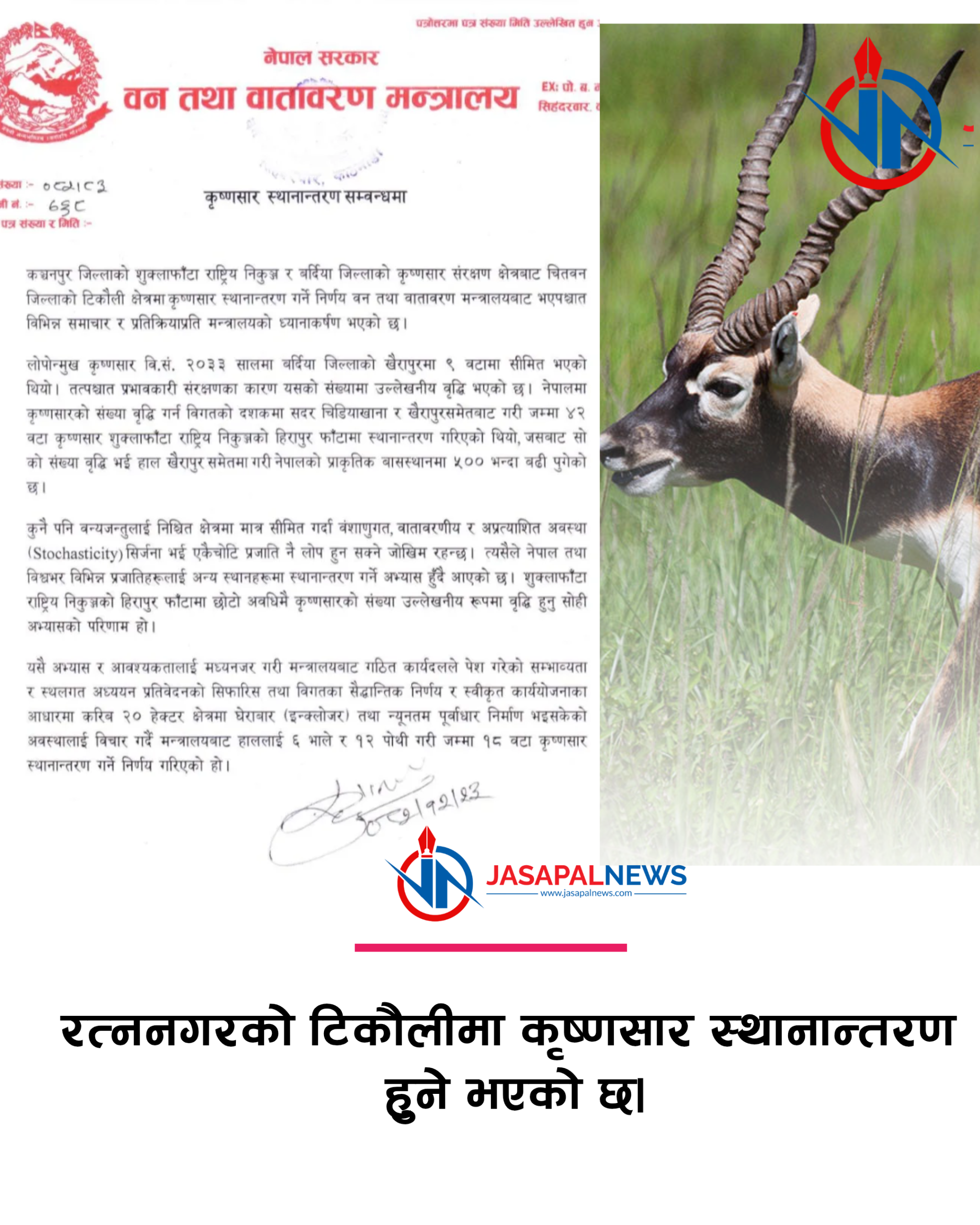 रत्ननगरको टिकौलीमा कृष्णसार स्थानान्तरण हुने भएको छ